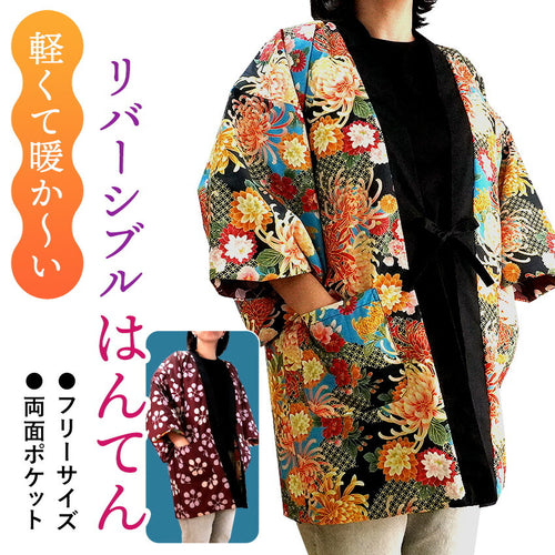 はんてん レディース 半纏 リバーシブル 黒 赤茶 紗綾型 扇 花 フリーサイズ リバーシブル 軽くて暖かい 部屋着やお散歩に 防寒・節電に