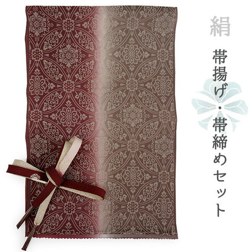 絹 帯揚げ帯締めセット フォーマル向き 帯あげ(ワインレッド×焦茶 七宝唐花柄) 丹後ちりめん 平組 帯〆 (臙脂) 和装小物 レディース