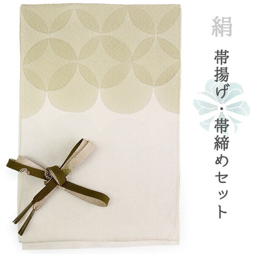 正絹 帯揚げ帯締めセット フォーマル向き 帯あげ(ウォームグレー×緑 ぼかし唐草柄) 丹後ちりめん 平組 帯〆 (ベージュ) 和装小物 レディース