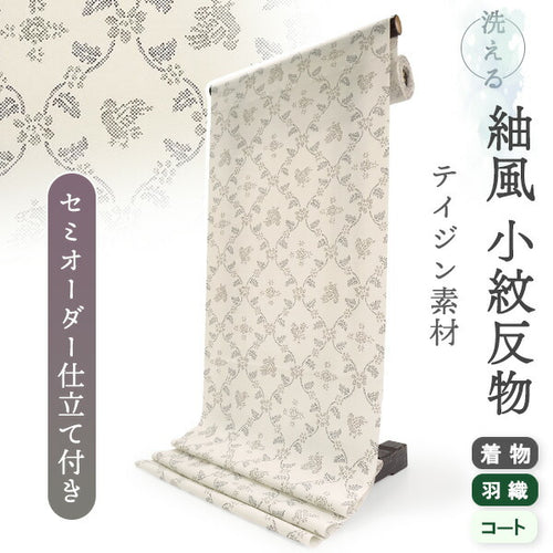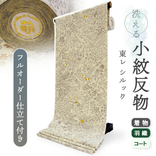 洗える着物 小紋 反物 東レシルック フルオーダー仕立て付 クリーム グレー 草花 美しいキモノ掲載 ぴったり自分サイズにお仕立てで着姿きれい 袷も単衣もオールシーズン対応
