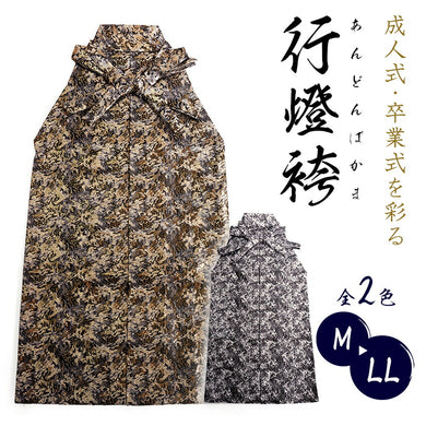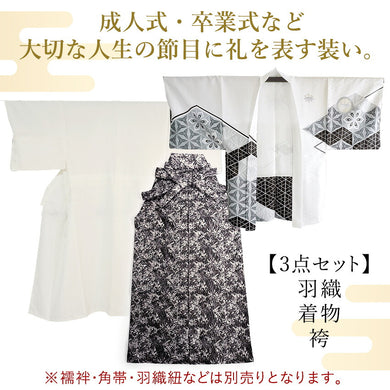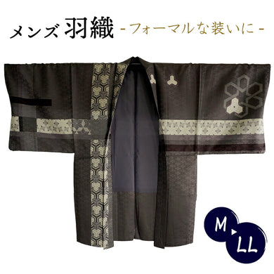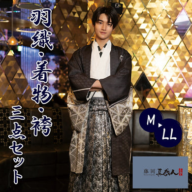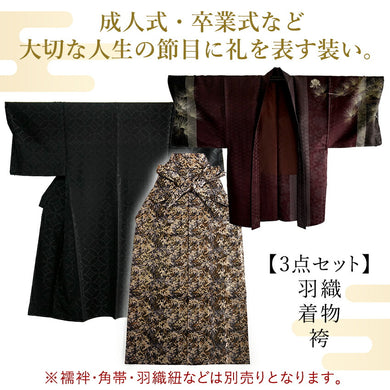 洗える メンズ羽織・着物・袴3点セット カーキ ゴールド 短冊 幾何学 M L LL 成人式や卒業式に