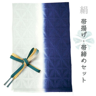 正絹 帯揚げ帯締めセット フォーマル向き帯揚げ (青×水色暈し 幾何学地紋) 平組 帯〆 (渋青) 和装小物 レディース