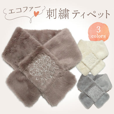 エコファー刺繍ティペット 全3色 アイボリー グレー モカ 着脱簡単なフェイクファーのマフラー 刺繍入りで首元を華やかに 洗えるポリエステル