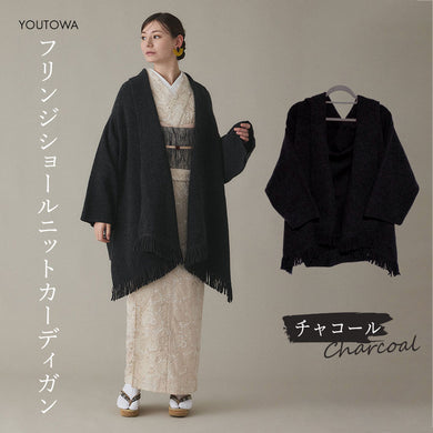 フリンジショールカーディガン チャコール YOUTOWA 着こなし2way!ショール風に道行風に、サッと羽織れる薄手ニットカーディガン