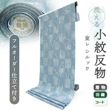 洗える着物 小紋 反物 東レシルック フルオーダー仕立て付 ブルーグレー 市松 柳 大久保信子流きもの ぴったり自分サイズにお仕立てで着姿きれい 袷も単衣もオールシーズン対応