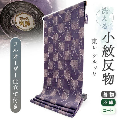 洗える着物 小紋 反物 東レシルック フルオーダー仕立て付 パープル 市松 柳 大久保信子流きもの ぴったり自分サイズにお仕立てで着姿きれい 袷も単衣もオールシーズン対応