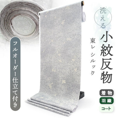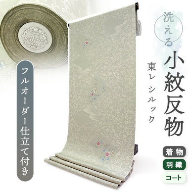 洗える着物 小紋 反物 東レシルック フルオーダー仕立て付 ライトグレー リーフ 美しいキモノ掲載 ぴったり自分サイズにお仕立てで着姿きれい 袷も単衣もオールシーズン対応