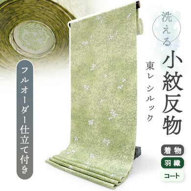 洗える着物 小紋 反物 東レシルック フルオーダー仕立て付 ペールグリーン リーフ 美しいキモノ掲載 ぴったり自分サイズにお仕立てで着姿きれい 袷も単衣もオールシーズン対応