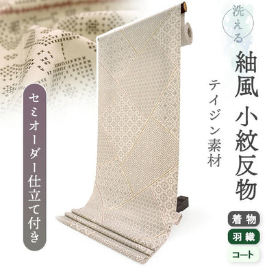 洗える 着物 反物 紬風 レディース セミオーダー 仕立て付 ベージュ 裂取り 亀甲 紗綾型 格天井 古典 XS S M L XL 袷 単衣 テイジン素材 NKF エヌケーエフ 和装 和服 女性 小紋 きもの 羽織 コート ポリエステル