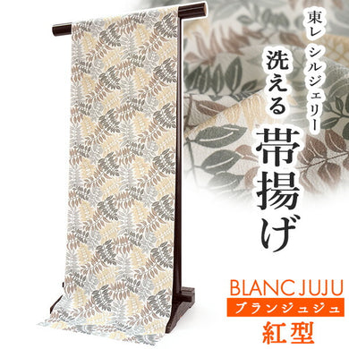 洗える帯揚げ モダンで可愛い紅型 ライトグレー地 リーフ 沖縄発ブランド・ブランジュジュのお洒落な帯あげ 東レシルジェリーの洗えるポリエステル素材 和装小物 春・秋・冬のカジュアルシーンに