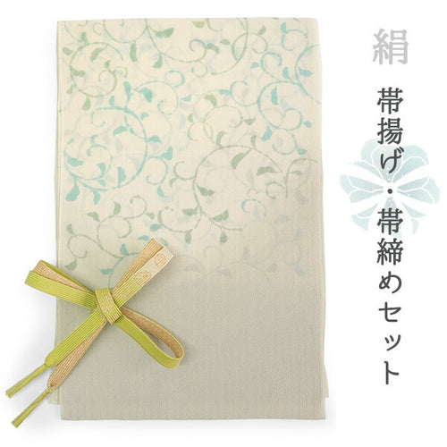 正絹 帯揚げ帯締めセット フォーマル向き 帯あげ(モスグレー×グリーン 縞に唐草柄) 平組 帯〆 (黄緑) 和装小物 レディース