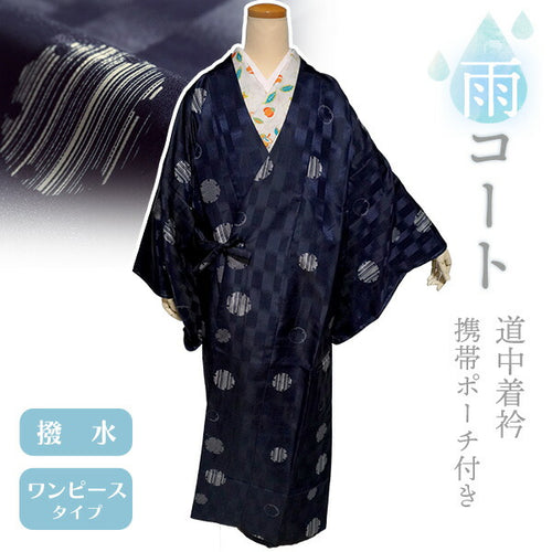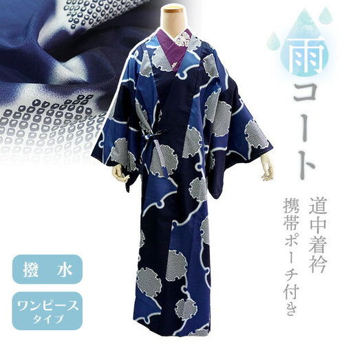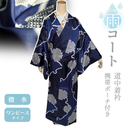 雨コート 一部式 道中着衿 ダークネイビー 雪輪 Lサイズ すぐに着られるお仕立て上がり 持ち運びに便利なポーチ付き 洗えるポリエステル