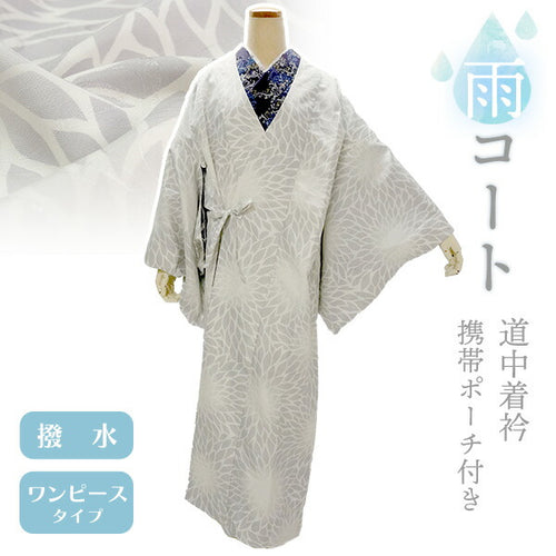 雨コート 一部式 道中着衿 オフホワイト 菊 Mサイズ Lサイズ すぐに着られる仕立て上がり 持ち運びに便利なポーチ付き 洗えるポリエステル