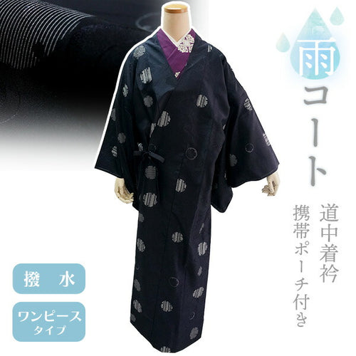 雨コート 一部式 道中着衿 ブラック ドット ぼかし 縞 Mサイズ Sサイズ すぐに着られる仕立て上がり 持ち運びに便利なポーチ付き 洗えるポリエステル