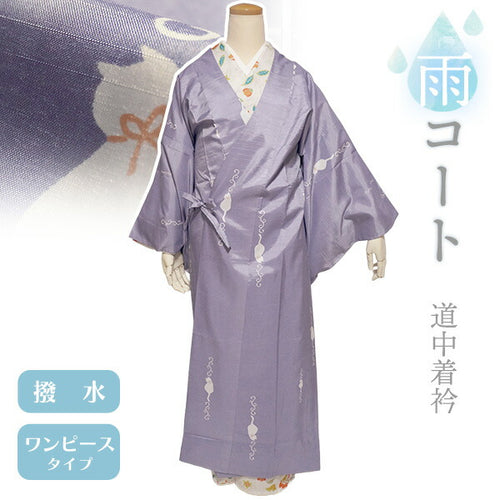 雨コート 一部式 道中着衿 パープル グレー 花 丸紋 Lサイズ すぐに着られるお仕立て上がり 持ち運びに便利なポーチ付き 洗えるポリエステル