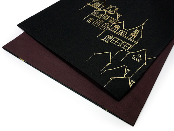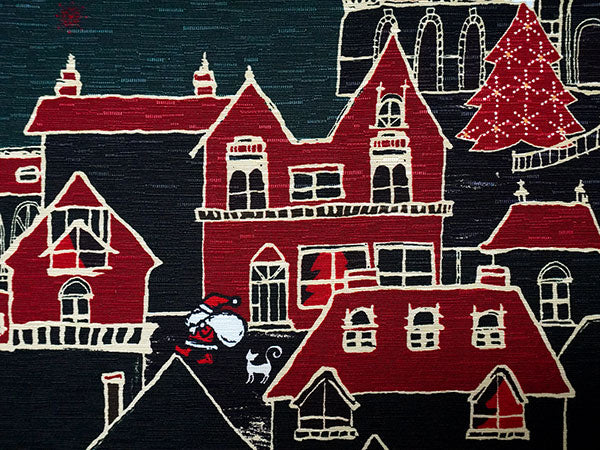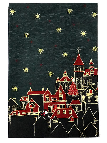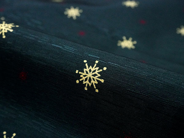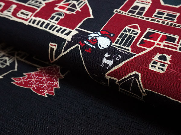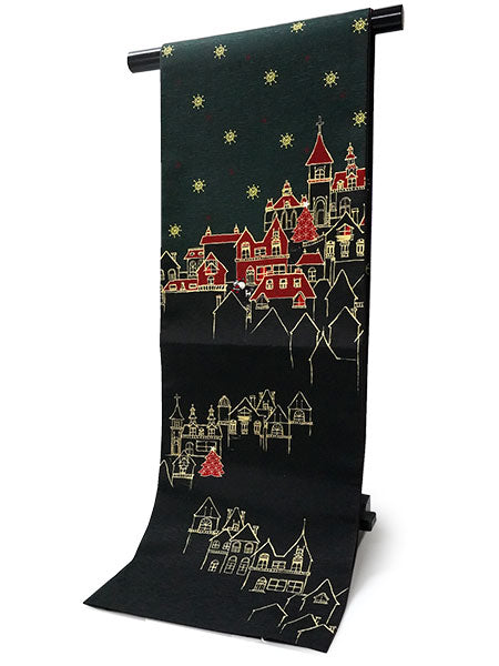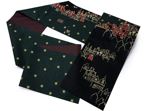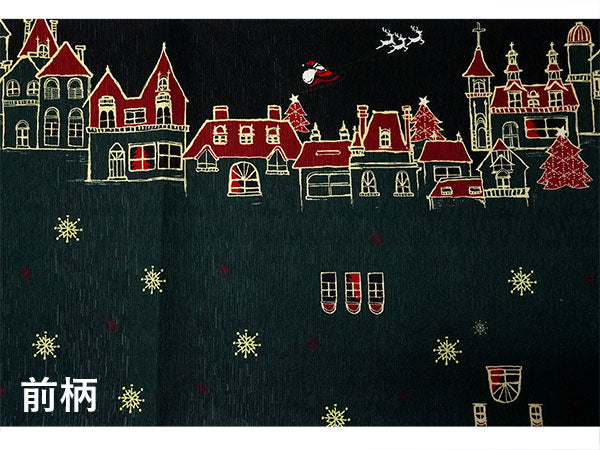| イヴの夜更けに粉雪が舞う中、サンタクロースがトナカイにのってソリでやってきています。 大きなプレゼントをもって街から街に大忙しです。 前柄はソリにのったトナカイと街並みバージョンと、窓辺の粉雪バージョンの2パターンがあります。 結び方によって異なる雰囲気を楽しめます。 |
