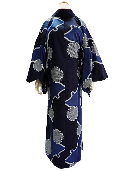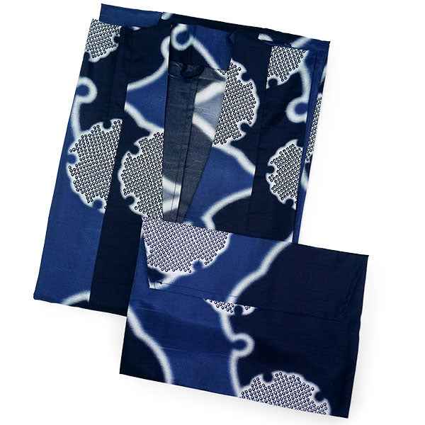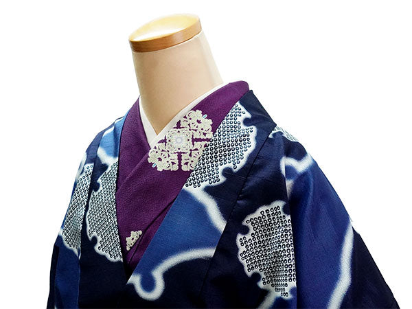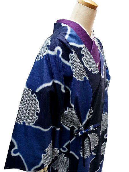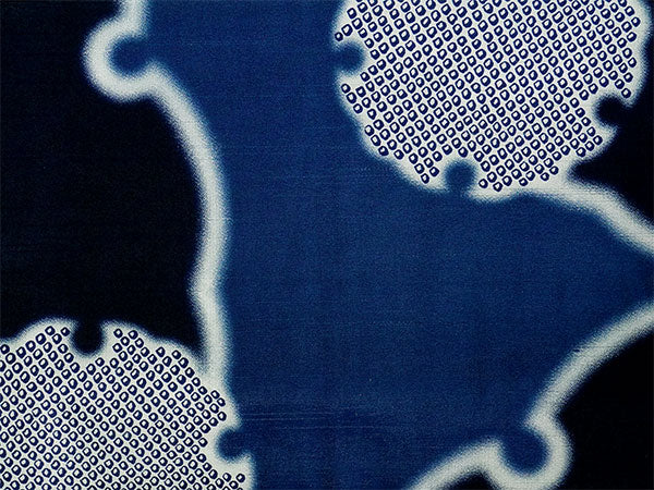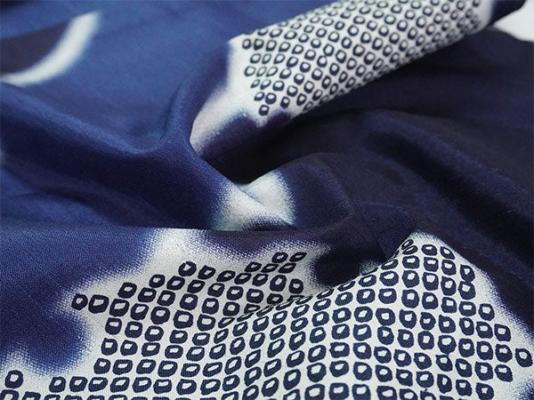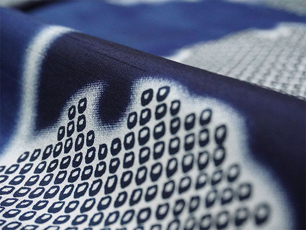 深い青色の地に、大小の雪輪が大胆に描かれています。白いぼかしの輪郭が輝くようで美しく、紺色や鹿の子柄のリズム感が楽しい粋な雰囲気のコートです。 ざらりとした手触りで光沢感があり、横向きの織りの風合いがある生地感です。 |