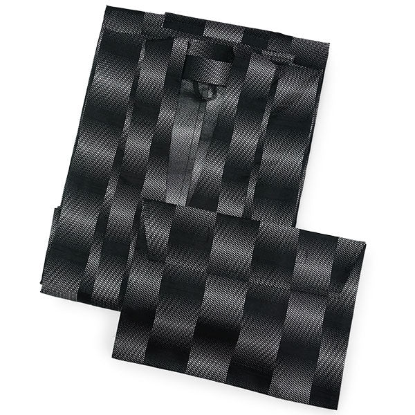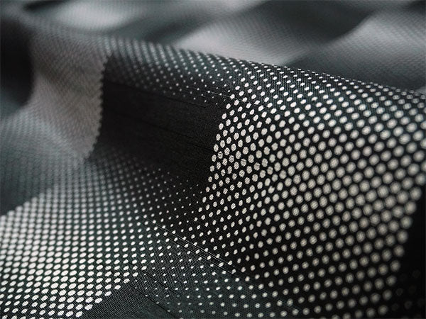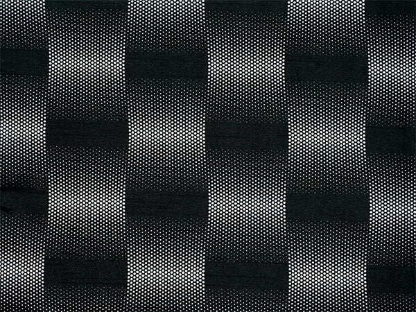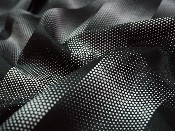 黒地に白でドット階調のぼかし縞が描かれています。シックできりっとした印象のコートです。 ざらりとした手触りでやや光沢感があり、横向きの織りの風合いがある生地感です。 |