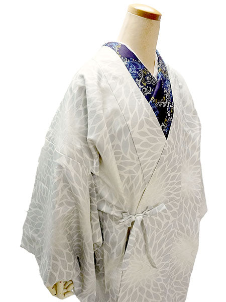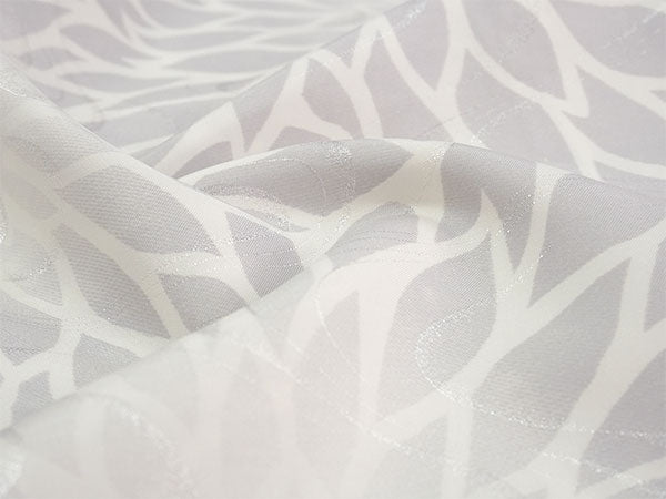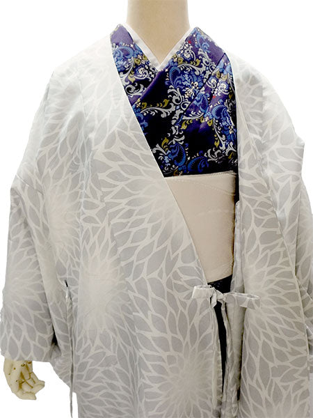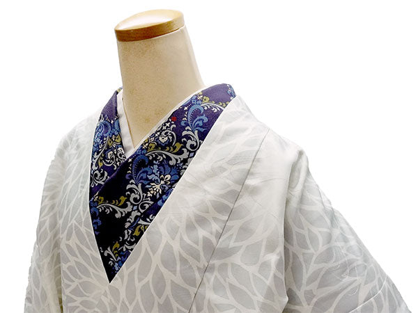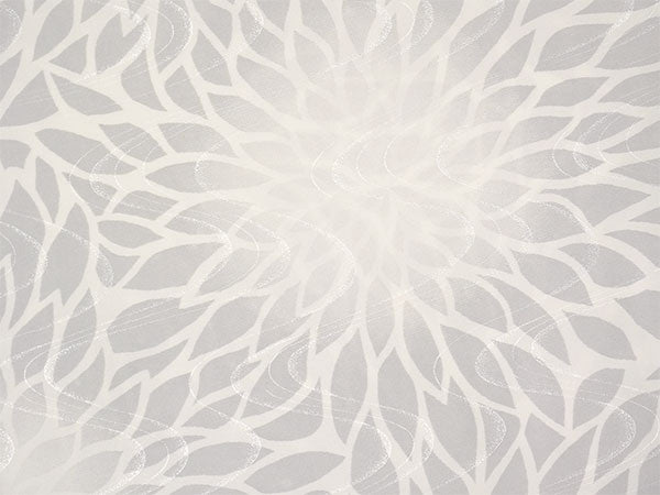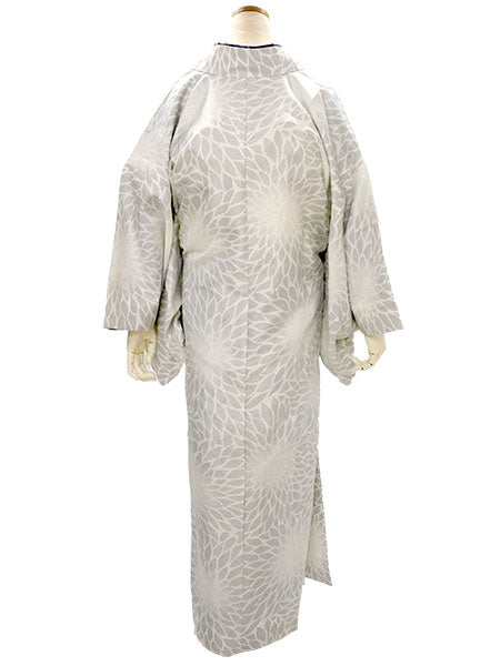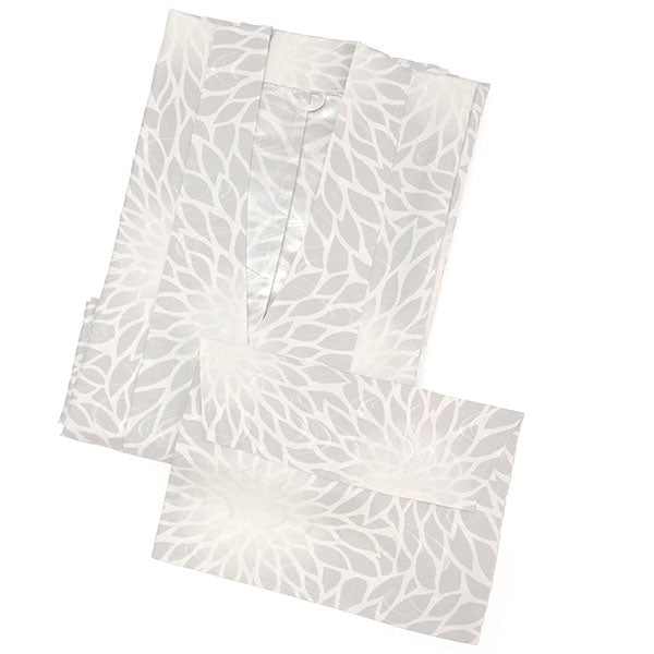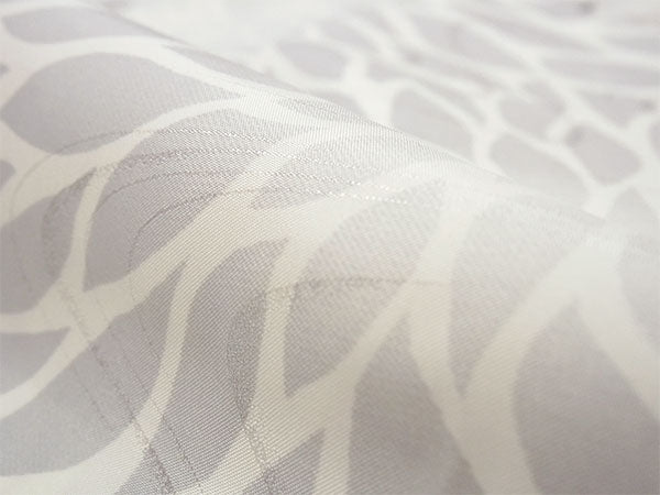 落ち着いた白の地に、版画のような雰囲気の灰色の菊が全面に敷き詰められています。ところどころ入ったぼかしの濃淡が美しく、銀色にゆらめく流水地紋が上品で清楚な雰囲気です。 やや光沢感がある生地感です。 |