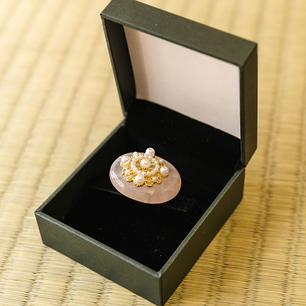 | 透明がかった淡いピンクの楕円形土台に、レースの花の形をしたパーツにパールのパーツがついています。 動く度に輝き、帯周りを華やかにしてくれます。 |