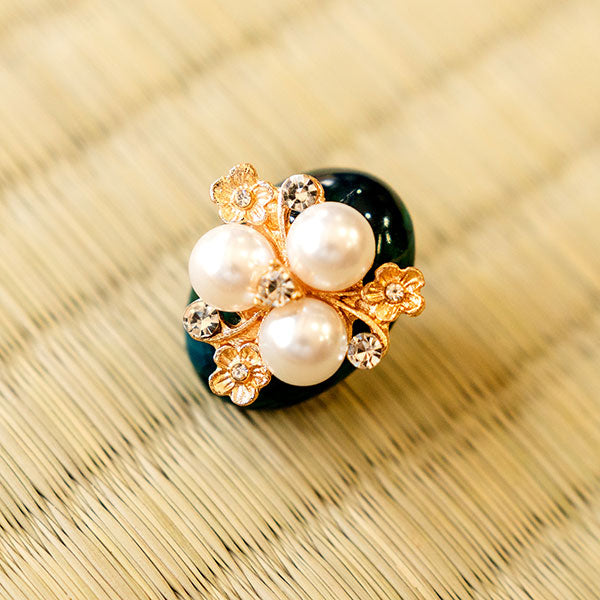 | 深い青緑のマーブル模様の楕円形土台に花の形にデザインされたパールとビーズのキラキラ輝くパーツがついています。 動く度に輝き、帯周りを華やかにしてくれます。 |