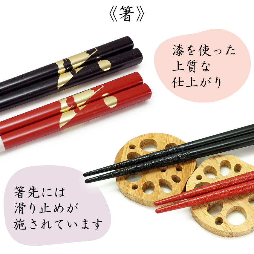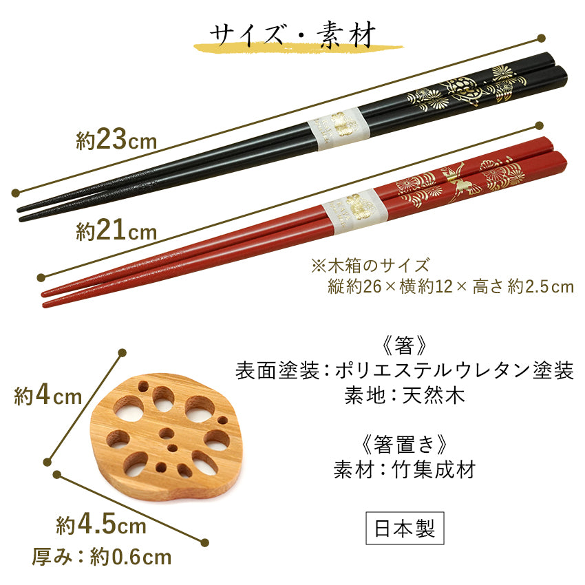 【夫婦箸】 ・黒色:約23cm ・朱色:約21cm 素地:天然木 表面塗装:ポリエステルウレタン塗装 【箸置き】 縦:約4.5cm、横:約4cm、厚み:約0.6cm 素材:竹集成材 <日本製> |