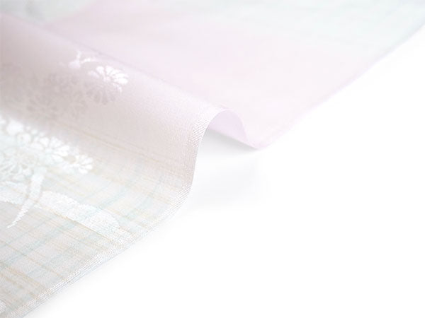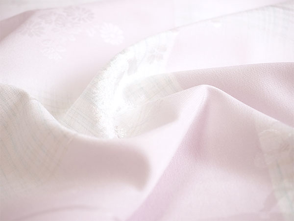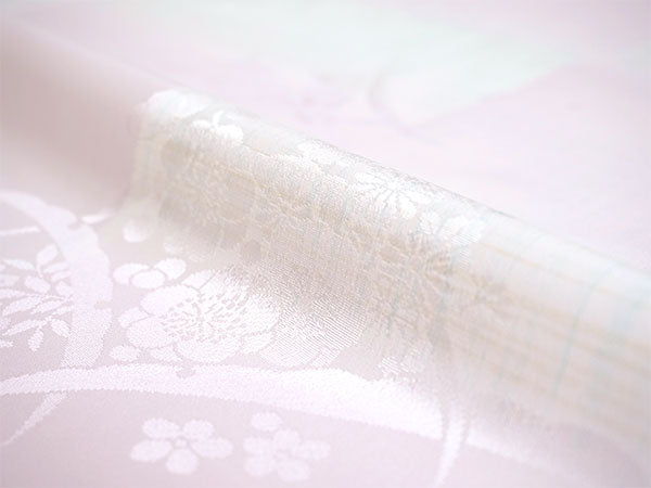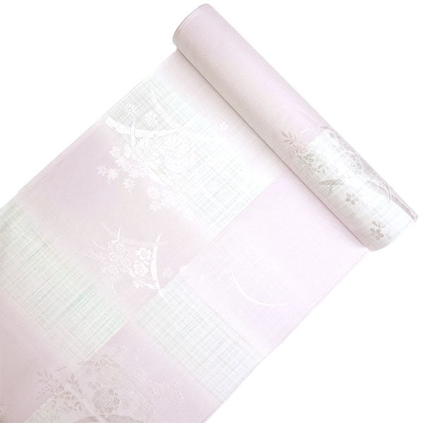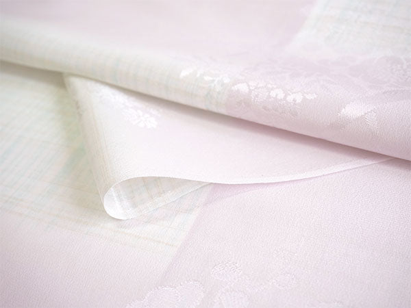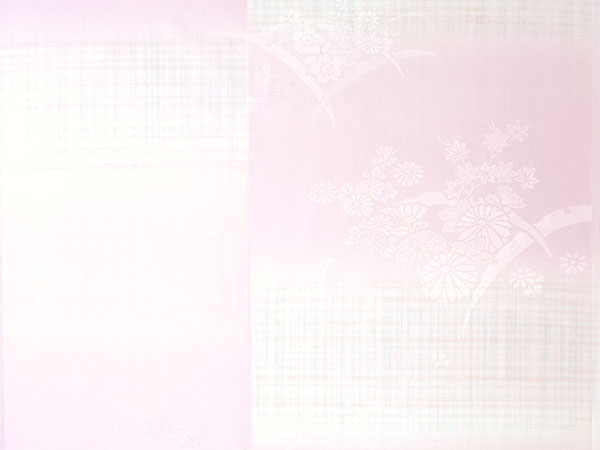 淡いピンクの地に、薄黄と薄青のかすれ格子が入った縦ぼかしが市松のように配されています。 菊、梅、桜、藤、紅葉などの四季花に雪輪のような弧を合わせた地紋が入っています。 美しく落ち着いた光沢感のある生地で、上品な雰囲気の長襦袢です。 |