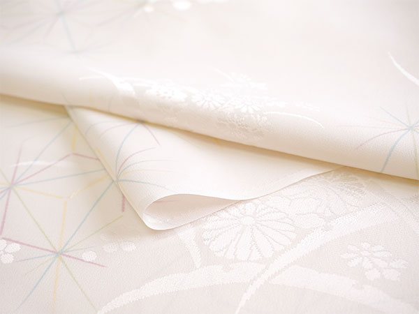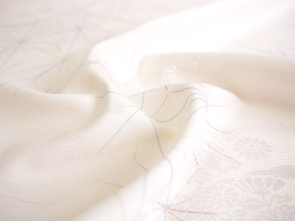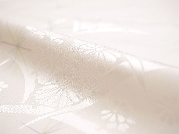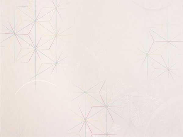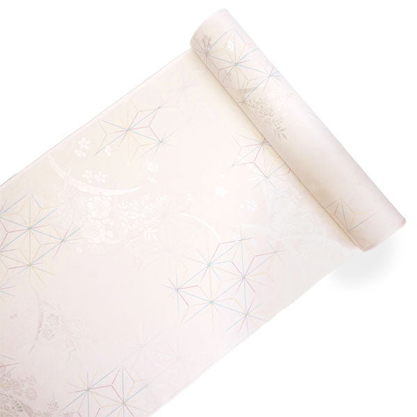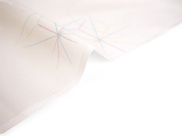 ごく淡いベージュの地に、カラフルな線描の麻の葉柄がところどころ浮き出ています。 菊、梅、桜、藤、紅葉などの四季花に雪輪のような弧を合わせた地紋が入っています。 美しく落ち着いた光沢感のある生地で、上品な雰囲気の長襦袢です。 |