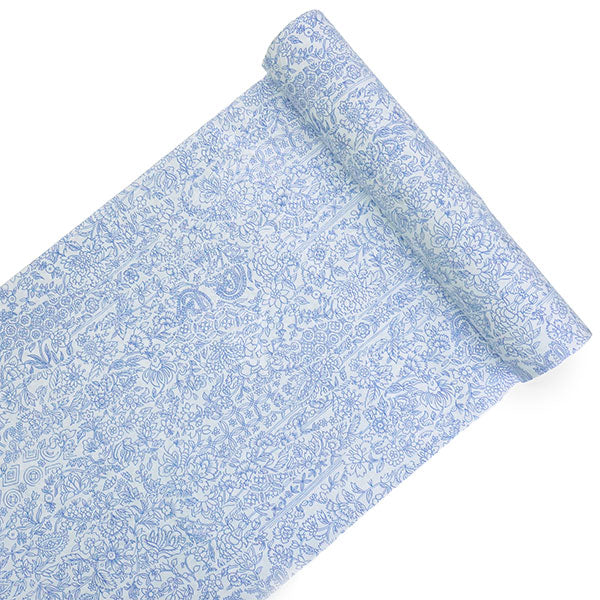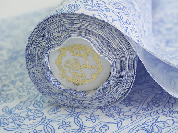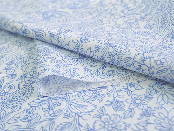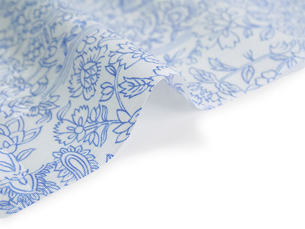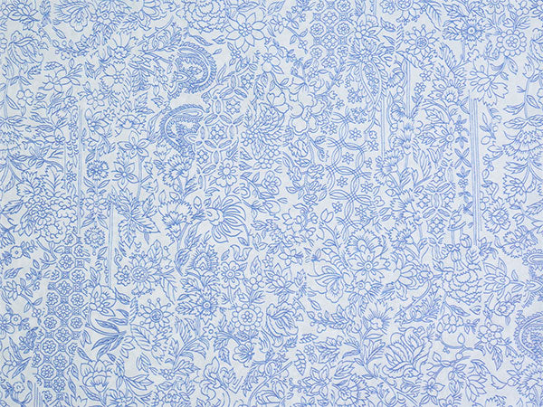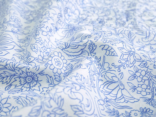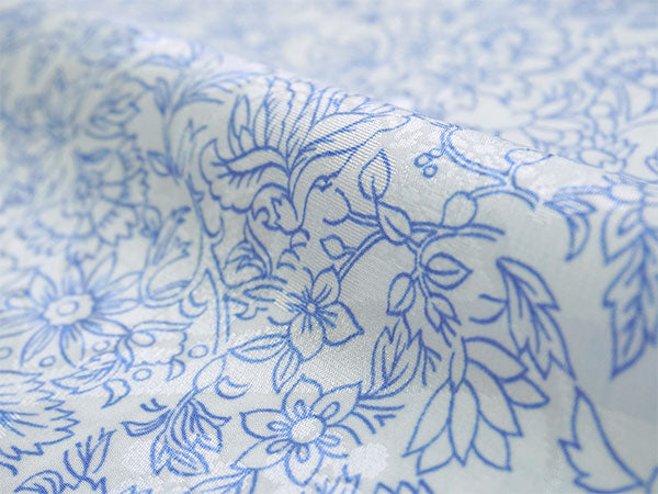 すっきりした白地に青でシンプルな描線の更紗柄が細かく敷き詰められています。 菊、梅、桜、藤、紅葉などの四季花に雪輪のような弧を合わせた地紋が入っています。 美しく落ち着いた光沢感のある生地で、上品な雰囲気の長襦袢です。 |