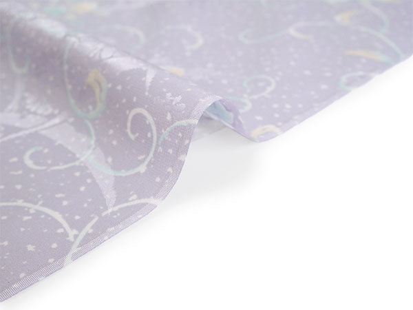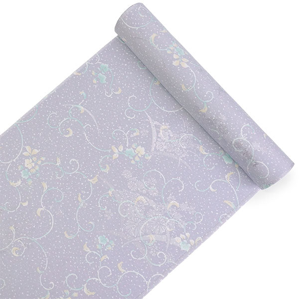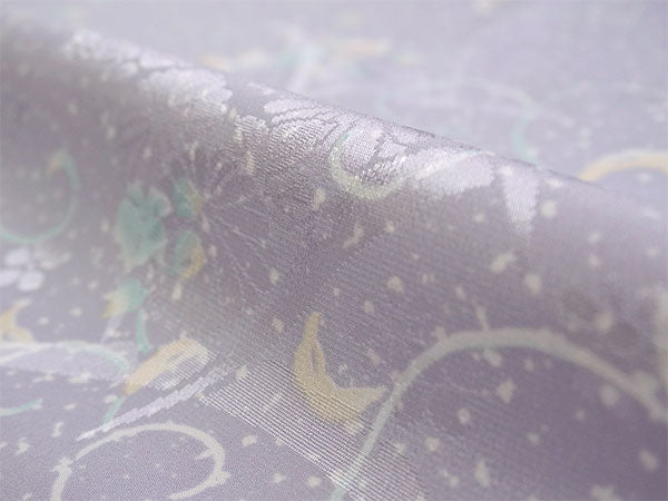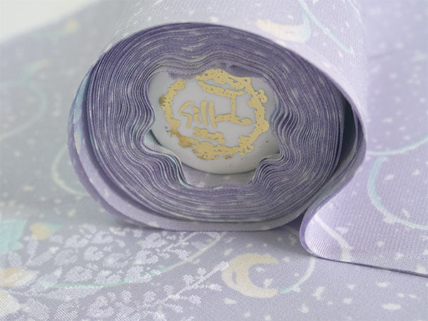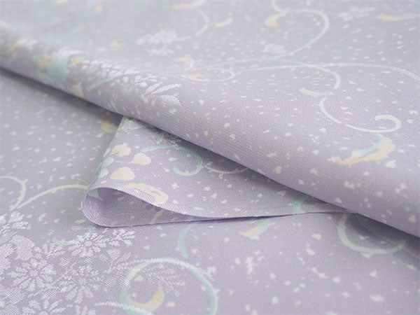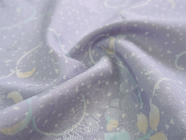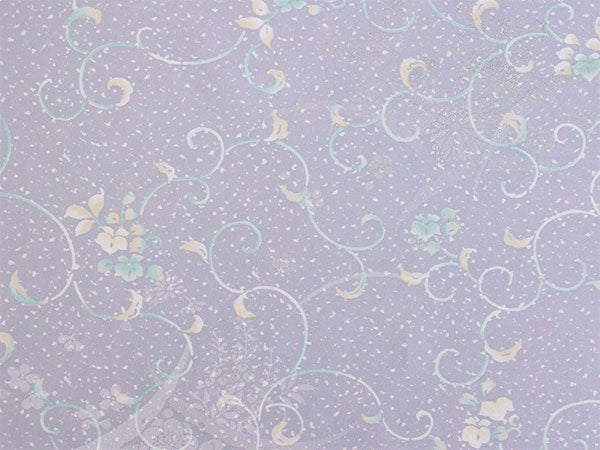 藤色の地に白く霰が散らされ、淡黄や緑でほんわりとしたシンプルな唐草が描かれています。 菊、梅、桜、藤、紅葉などの四季花に雪輪のような弧を合わせた地紋が入っています。 美しく落ち着いた光沢感のある生地で、上品な雰囲気の長襦袢です。 |