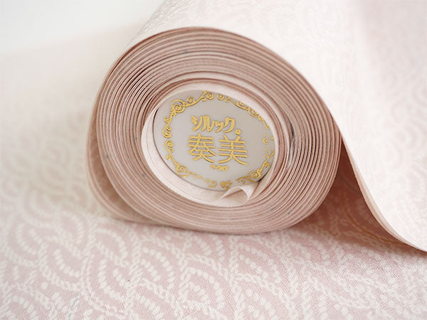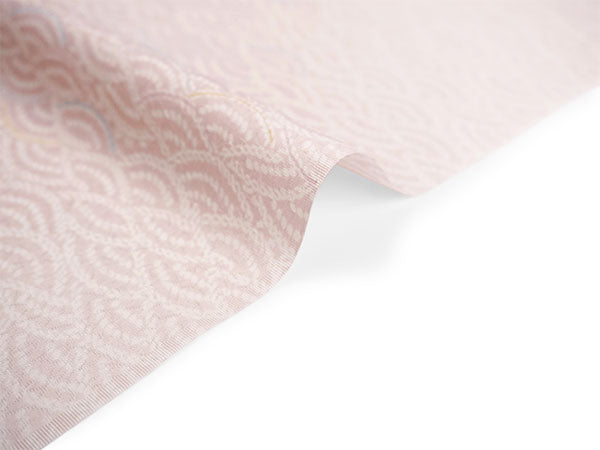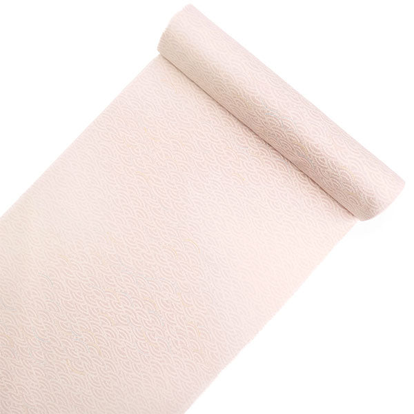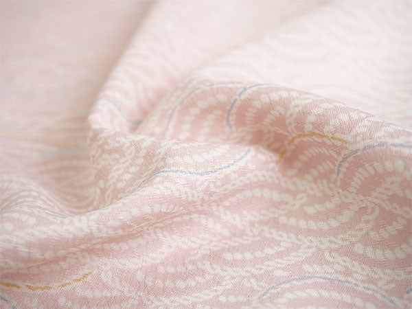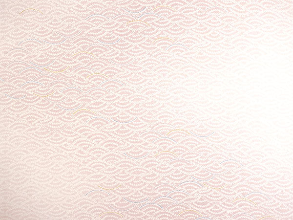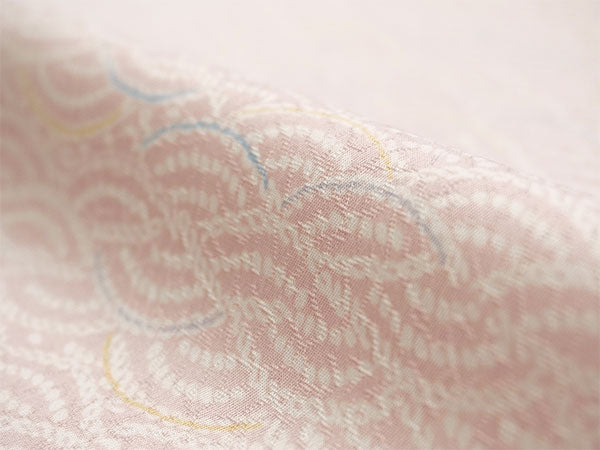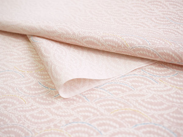 氷割れ地紋が入った薄桃色のぼかし地に、綱のような描線で波模様が描かれています。 レースを敷き詰めたようにも見える柔らかな色彩で、ほわりと上品な可愛らしさのある柄ゆきです。 |