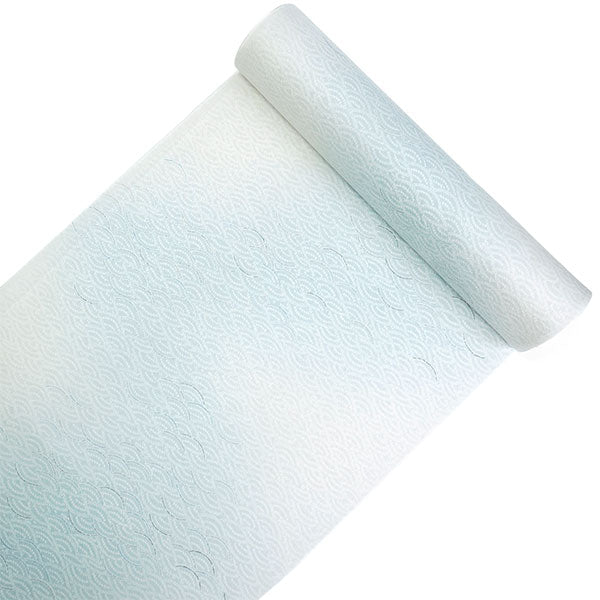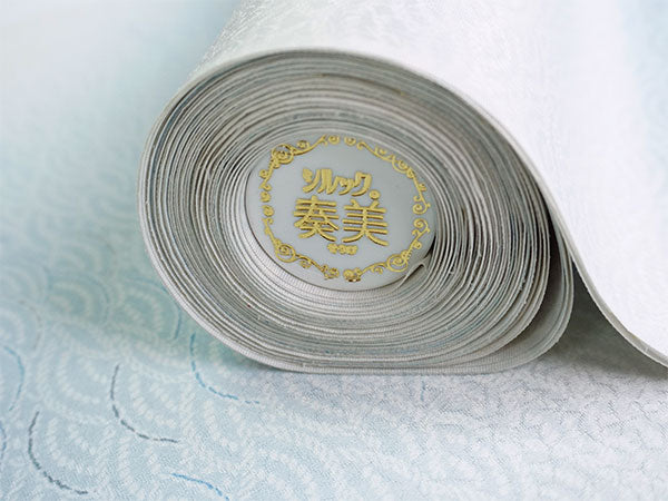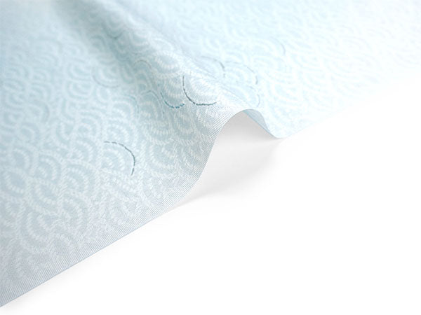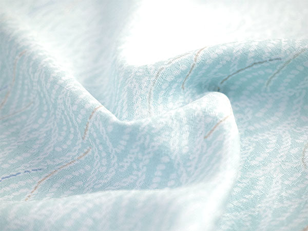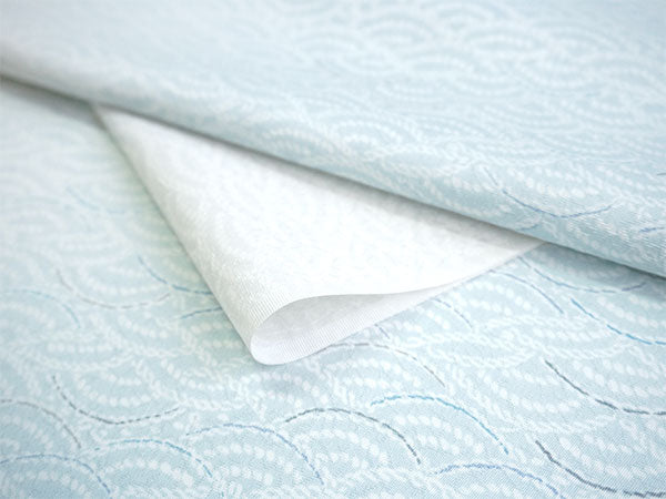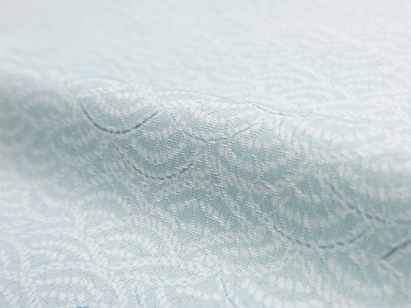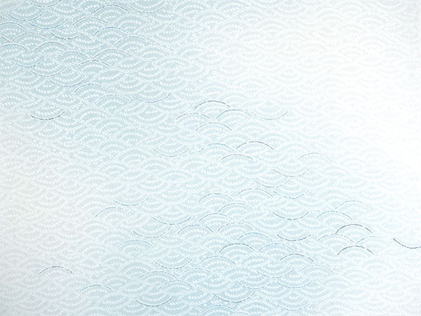 氷割れ地紋が入った薄水色のぼかし地に、綱のような描線で波模様が描かれています。 レースを敷き詰めたようにも見える柔らかな色彩で、ほわりと上品な可愛らしさのある柄ゆきです。 |