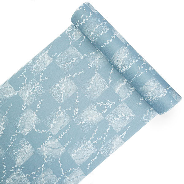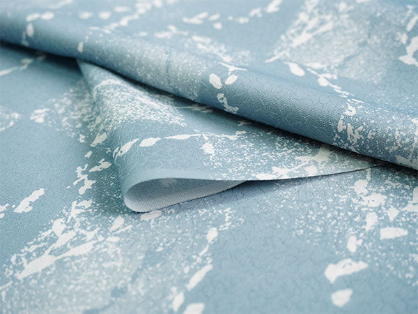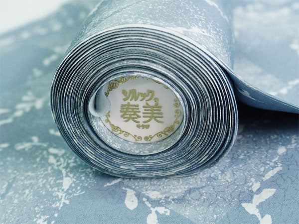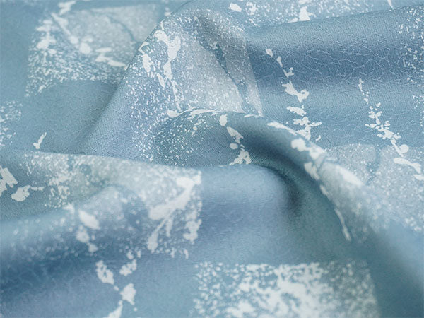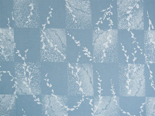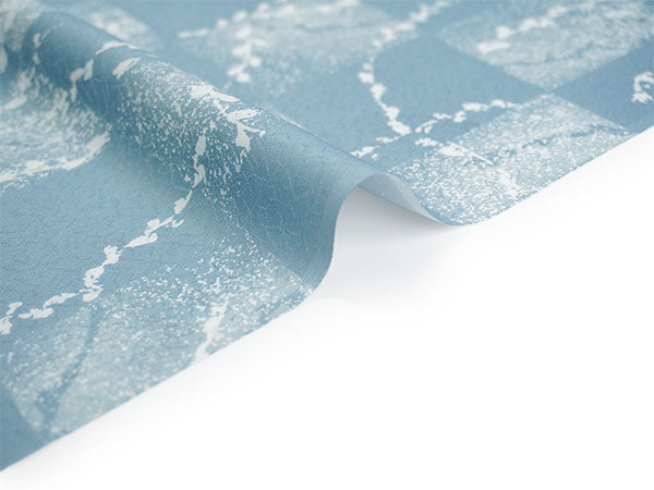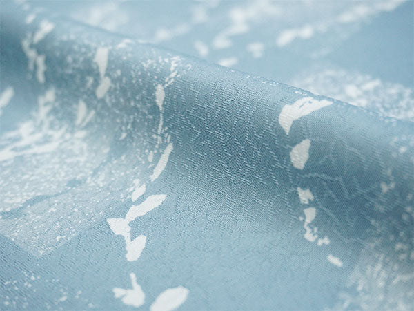 氷割れ地紋が入った青灰色の地に、飛沫のようなテクスチャの市松柄と柳の枝葉がシンプルな白でデザインされています。 海のようにも見える冴え冴えした色柄は、品良く端正で躍動感のある雰囲気です。 |