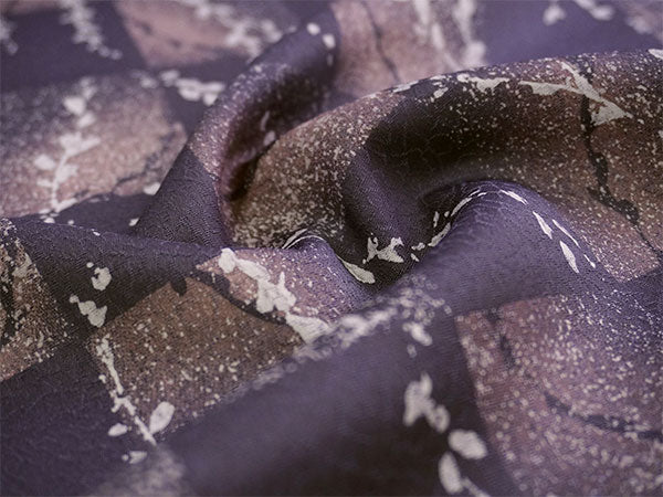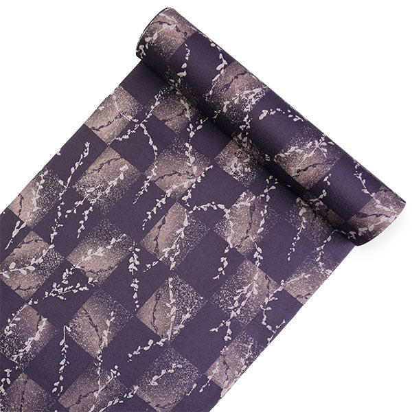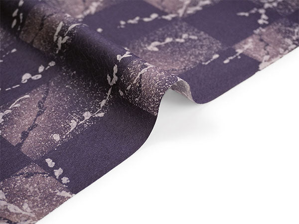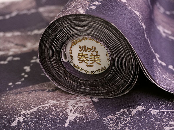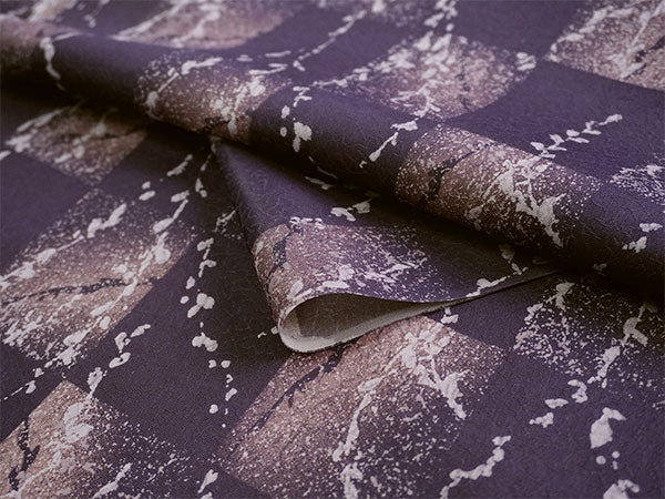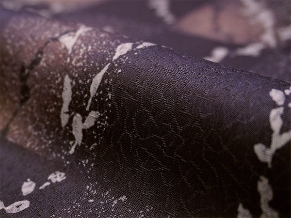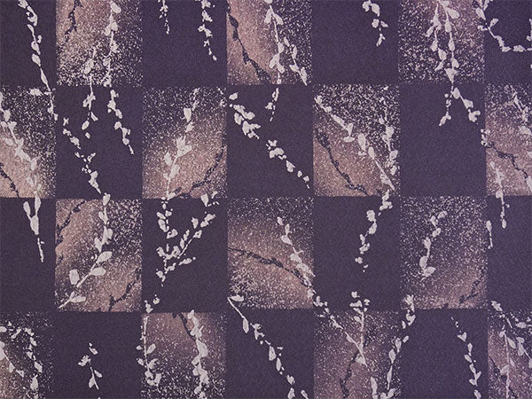 氷割れ地紋が入ったくすみ紫の地に、飛沫のようなテクスチャの市松柄と柳の枝葉が赤みの淡紫でデザインされています。 美しいグラデーションと淡いきらめきのような色柄は、大人っぽく上品な華のある雰囲気です。 |