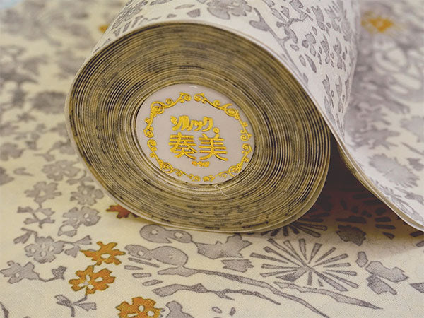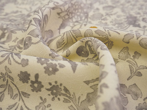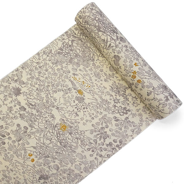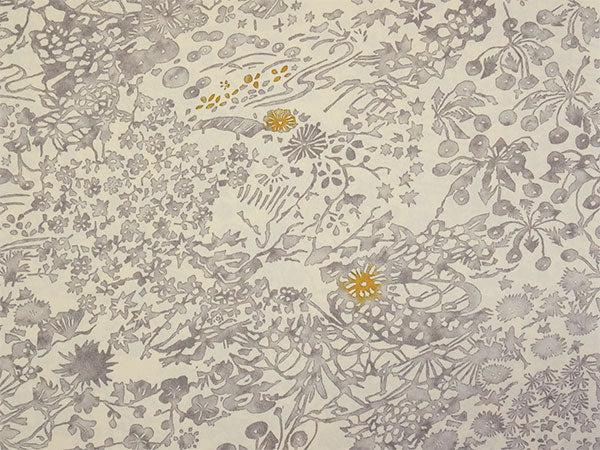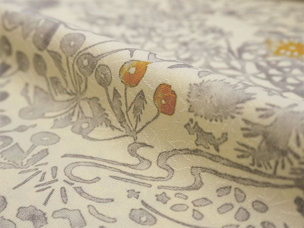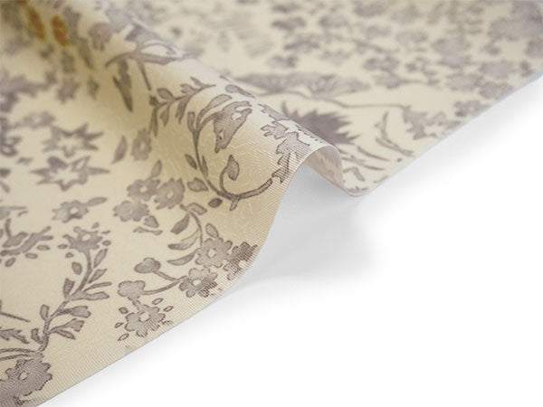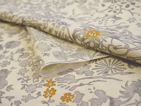 氷割れ地紋が入った薄黄の地に、水彩のような四季の草花が温みのあるグレーで描かれています。 輪郭と濃淡で表現するタッチはまとまり良く透明感があり、品よく華を添えてくれる柄ゆきです。 |