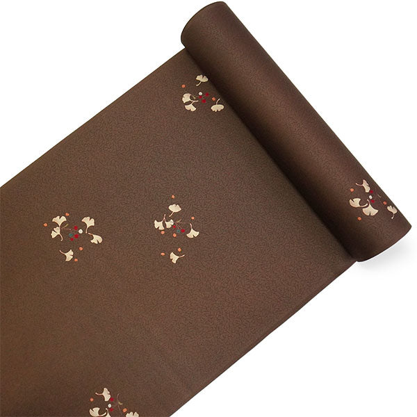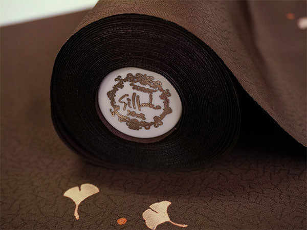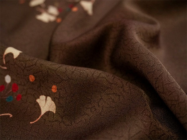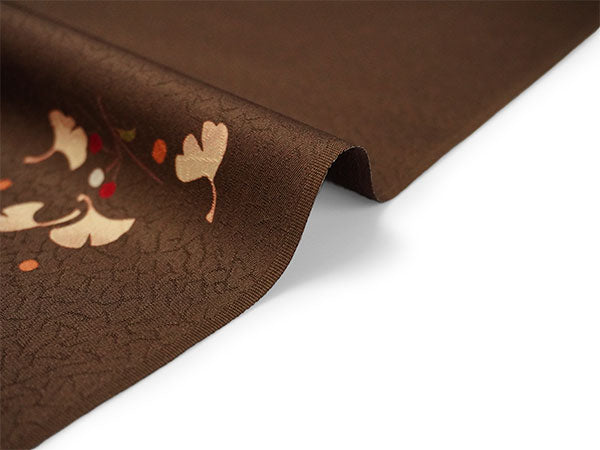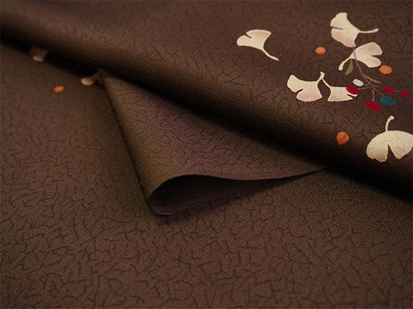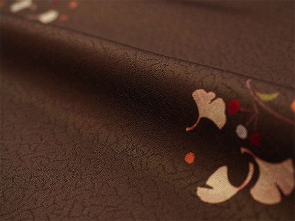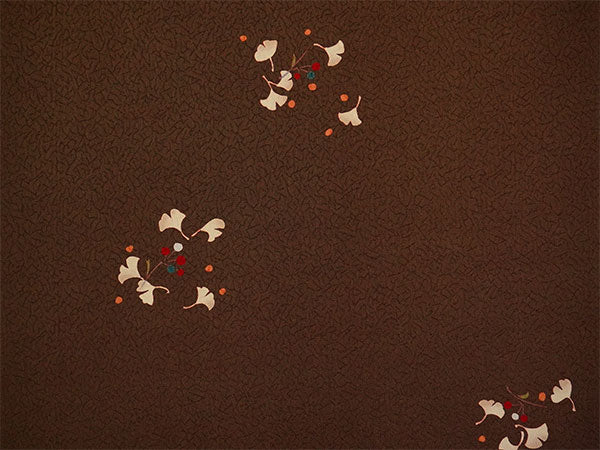 氷割れ地紋が入った茶色の地に、可愛らしい飛び柄の銀杏が描かれています。 秋らしくこっくりした色味が素敵でナチュラルな雰囲気の柄ゆきです。 |