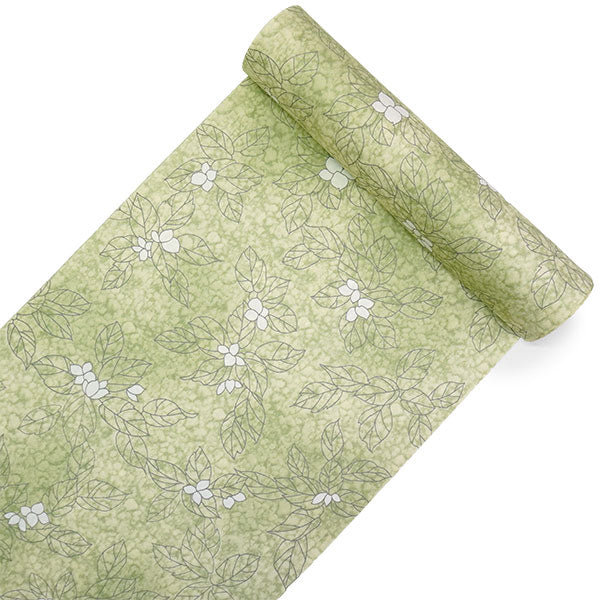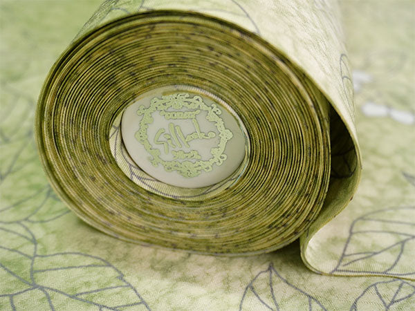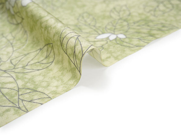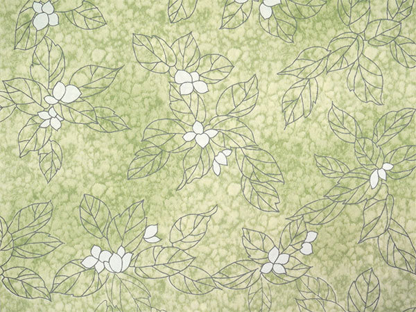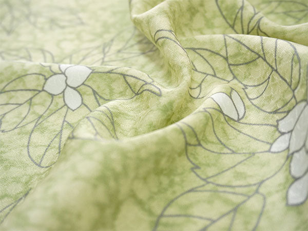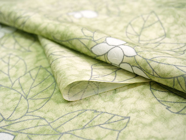 氷割れ地紋が入った明るい萌黄色の地に、シンプルな葉と実が全面に描かれています。 地色の靄ぼかしが華やかなニュアンスを添え、品よく爽やかな印象の柄ゆきです。 |