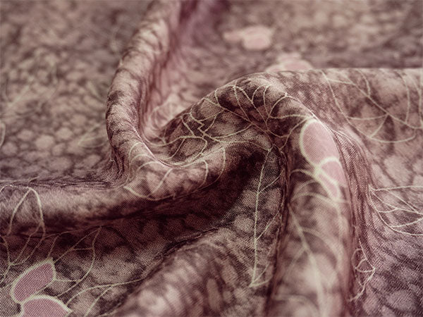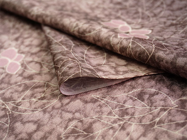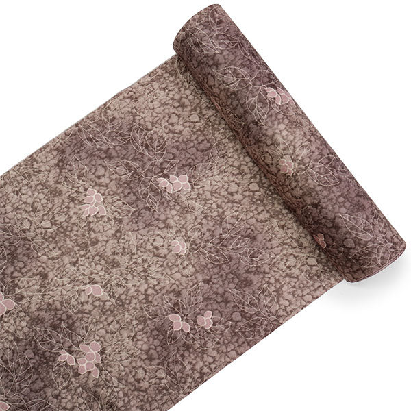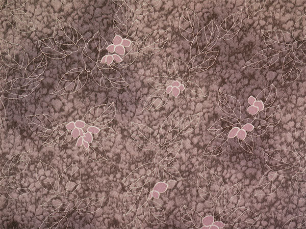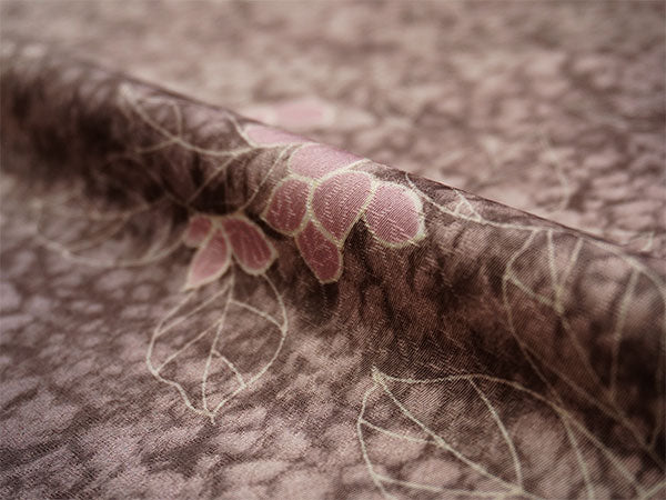 氷割れ地紋が入ったココアブラウンの地に、シンプルな葉と実が全面に描かれています。 地色の靄ぼかしが華やかなニュアンスを添え、品よく端正な印象の柄ゆきです。 |