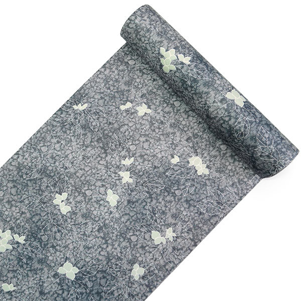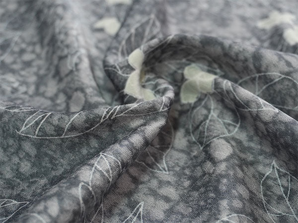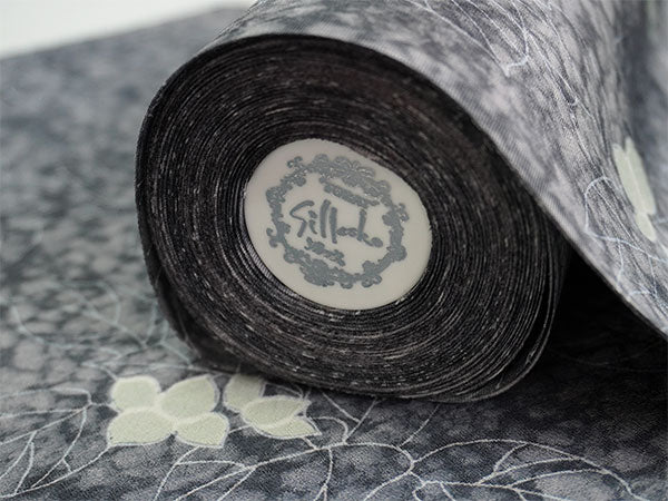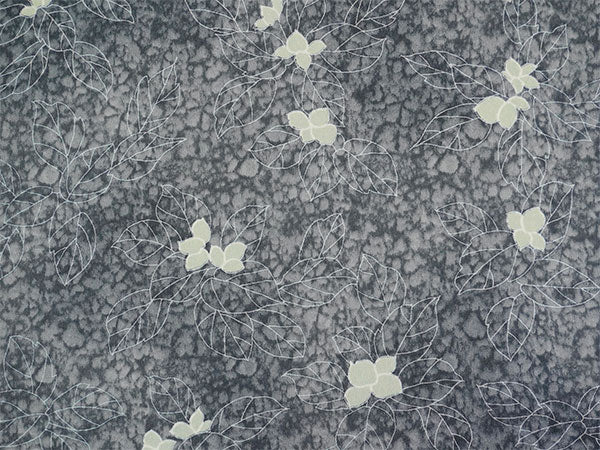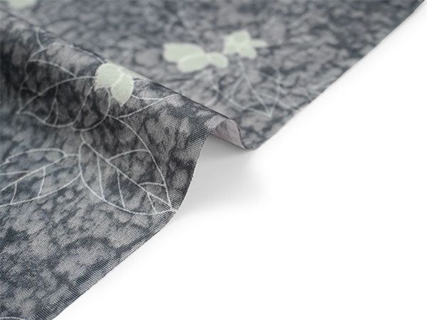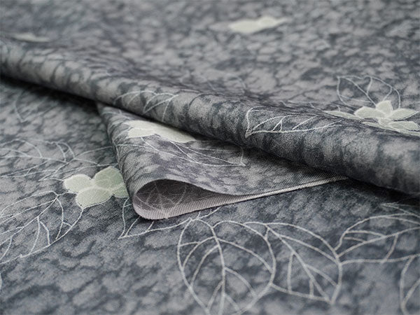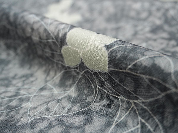氷割れ地紋が入った灰色の地に、シンプルな葉と実が全面に描かれています。 地色の靄ぼかしが華やかなニュアンスを添え、品よく端正な印象の柄ゆきです。 |