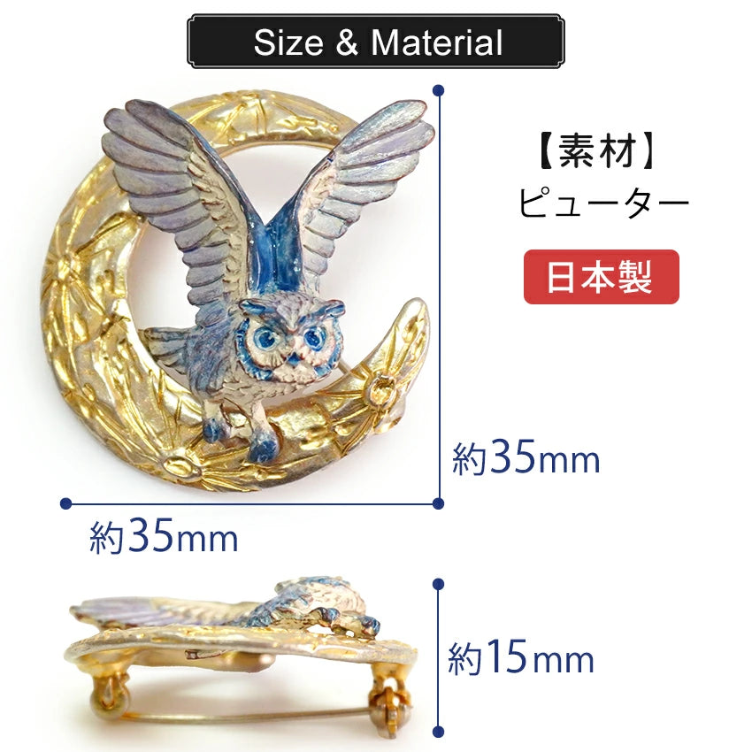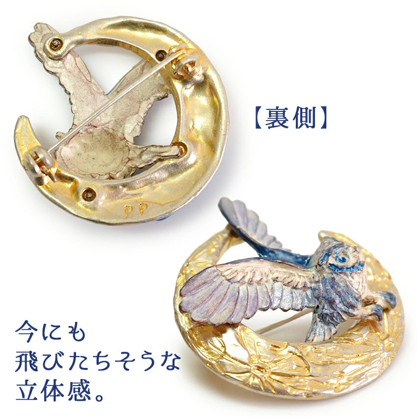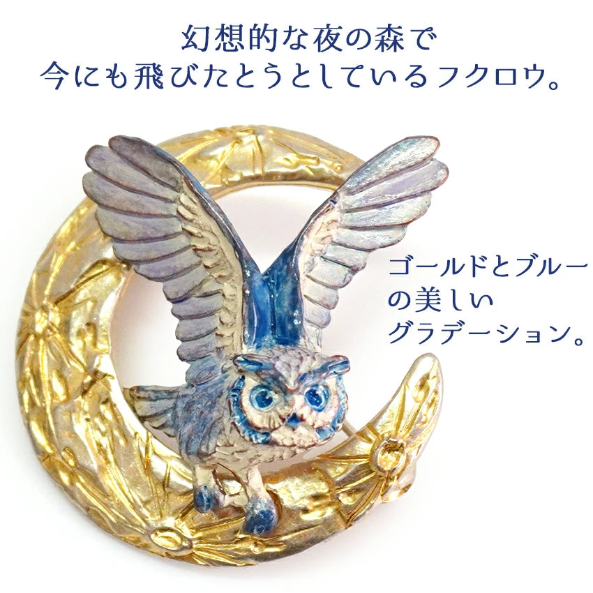 今にも羽ばたこうとするフクロウをモチーフにしたブローチです。 ゴールドとブルーの美しいグラデーションが、幻想的で静かな冬の森を思わせます。 |