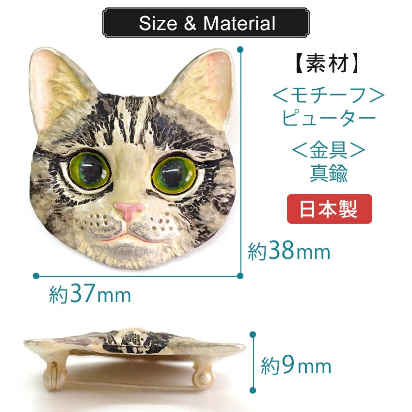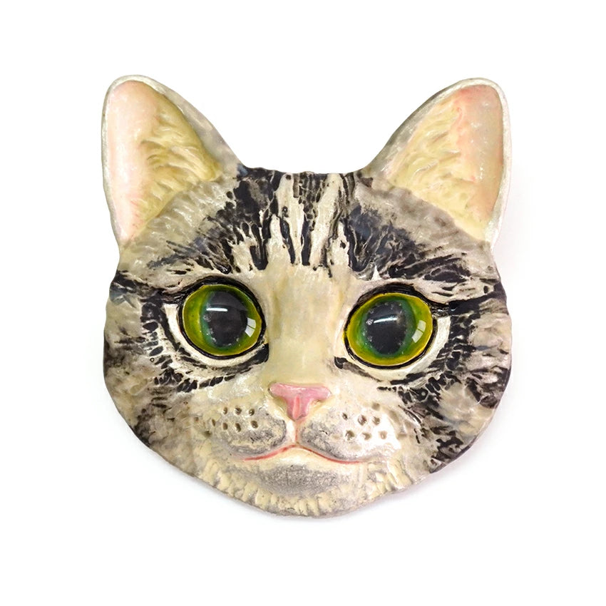 こちらをじっと見つめるような、あいくるしい表情が印象的な猫のブローチです。 蓄光仕様の塗装により、暗闇の中でぼんやりと光る丸い瞳。 柔らかそうな毛並みや特徴的な模様の細部まで丁寧に作り込まれている、立体的な仕上がりです。 |