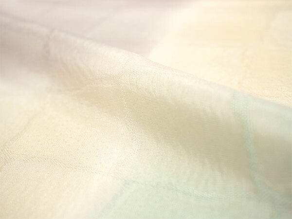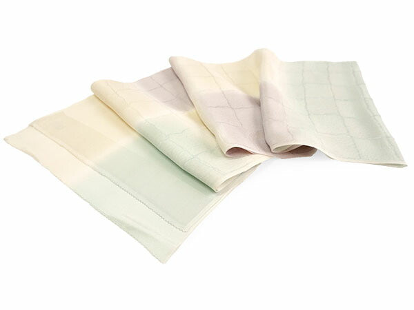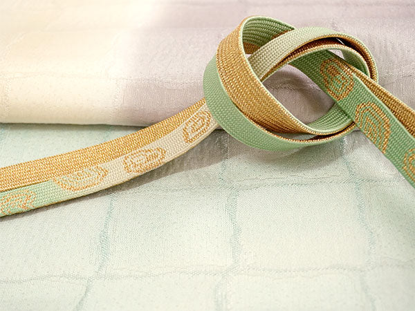 【帯揚げ】 ゆらぎ市松 薄黄×薄緑×薄紫 【帯締め】 平組 薄黄緑×白(裏面ゴールド)渦柄 |