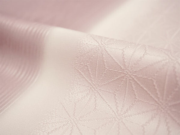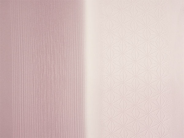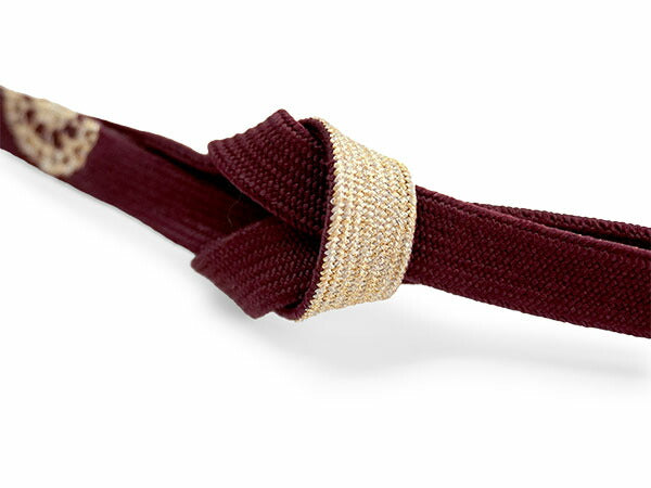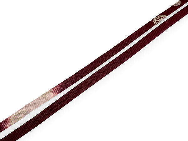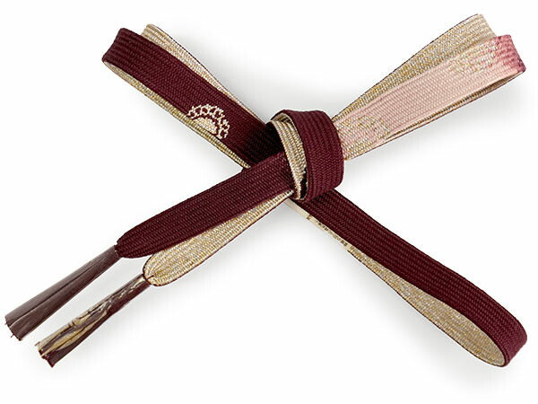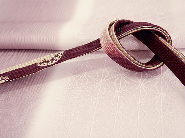 【帯揚げ】 麻の葉・滝縞地紋 薄小豆(縦暈し) 【帯締め】 平組 ボルドー×ピンク(裏面シルバー&ゴールド)車柄 |