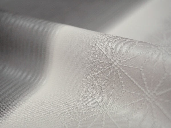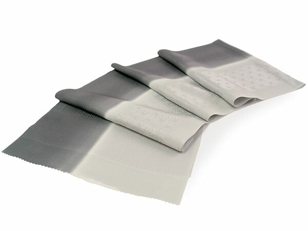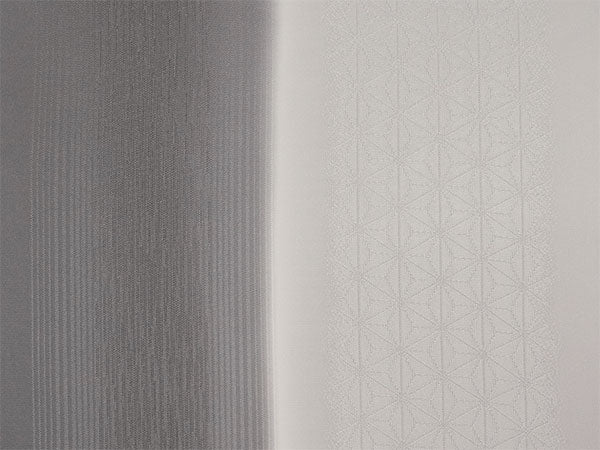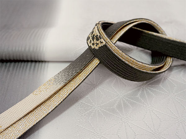 【帯揚げ】 麻の葉・滝縞地紋 灰色(縦暈し) 【帯締め】 平組 チャコール×オフホワイト(裏面シルバー&ゴールド)車柄 |