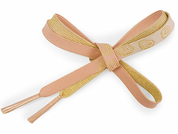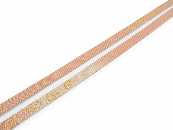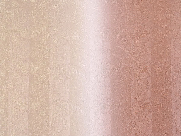【帯揚げ】 棒縞に双鳥唐草地紋 薄蘇芳×ベージュ(縦暈し) 【帯締め】 平組 珊瑚色×オフホワイト(裏面ゴールド)渦柄 |