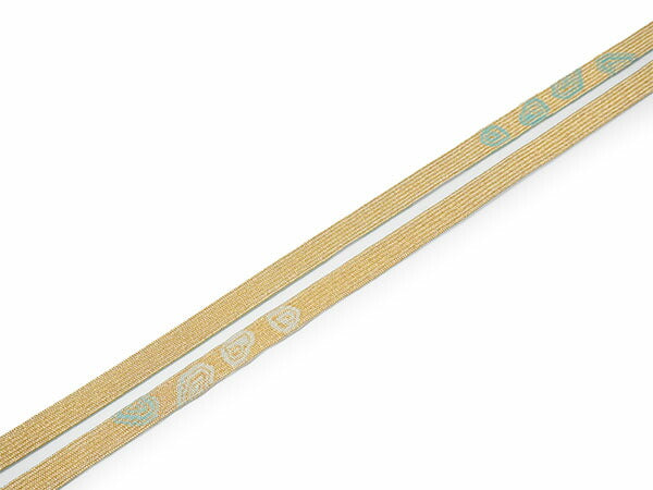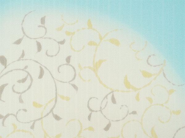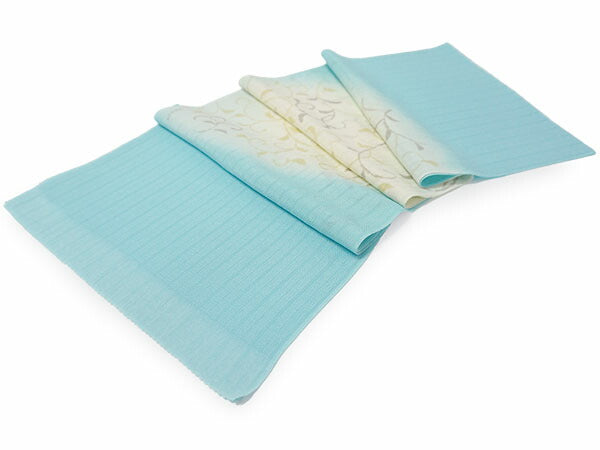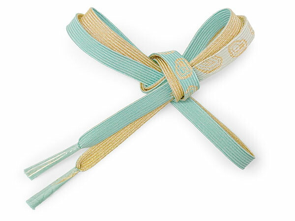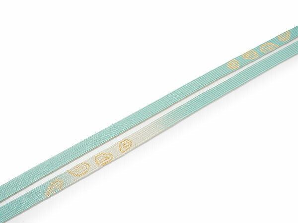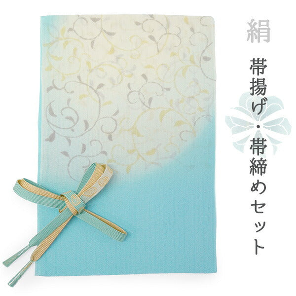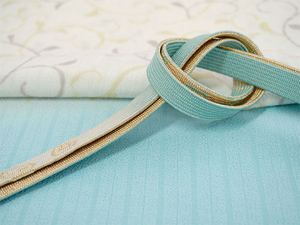 【帯揚げ】 縮緬縞 水色×生成色(暈し)茶系唐草柄 【帯締め】 平組 水色×白(裏面ゴールド)渦柄 |