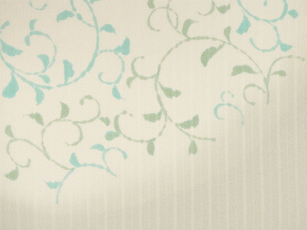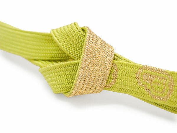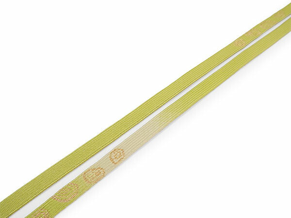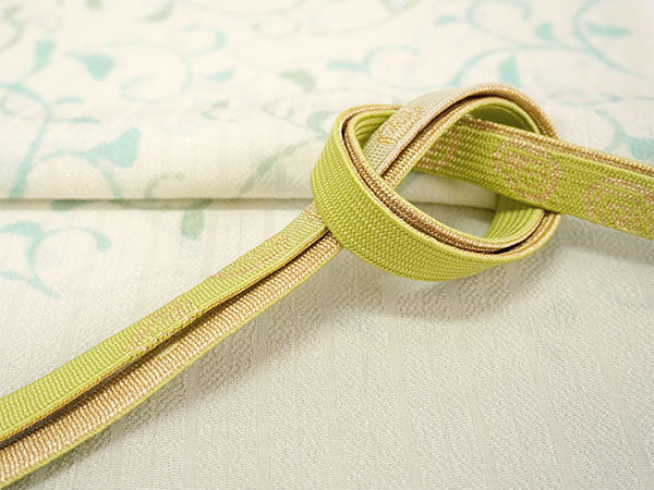 【帯揚げ】 縮緬縞 利休鼠×生成色(暈し)緑系唐草柄 【帯締め】 平組 黄緑×オフホワイト(裏面ゴールド)渦柄 |