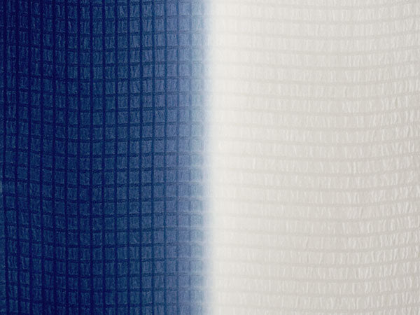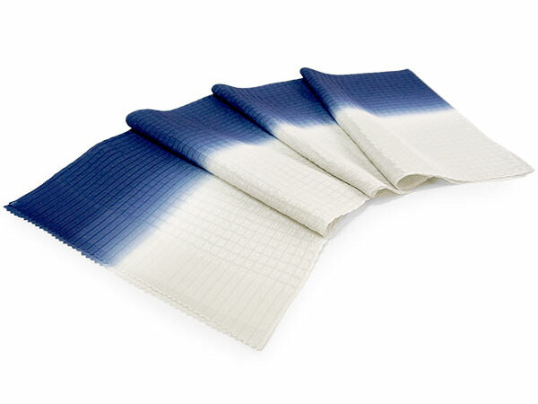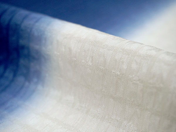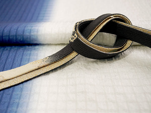 【帯揚げ】 シボ格子 深青×グレー系オフホワイト(縦暈し) 【帯締め】 平組 墨黒×オフホワイト(裏面シルバー&ゴールド)車柄 |