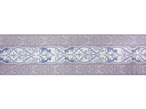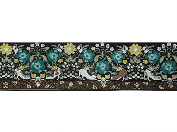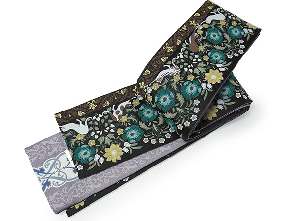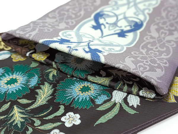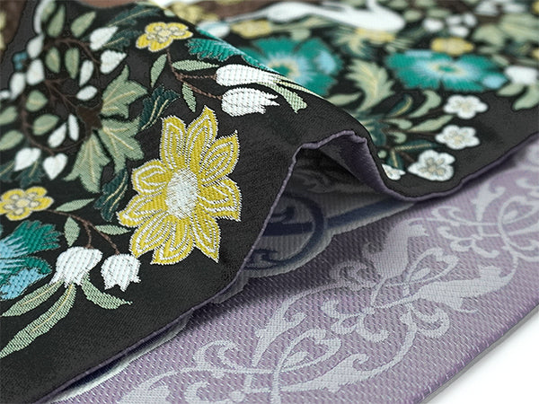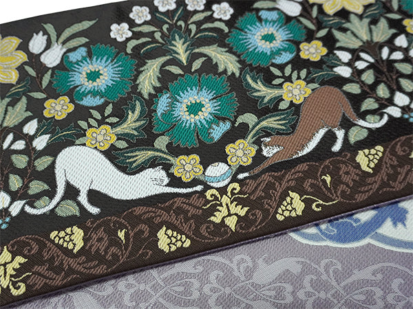 表:黒地にお花とねこが可愛く織り込まれています。どこかノスタルジックな雰囲気もするおしゃれな帯です。 裏:グレーパープル地に猫をモチーフとしたレース柄がシンプルに織り込まれています。 |