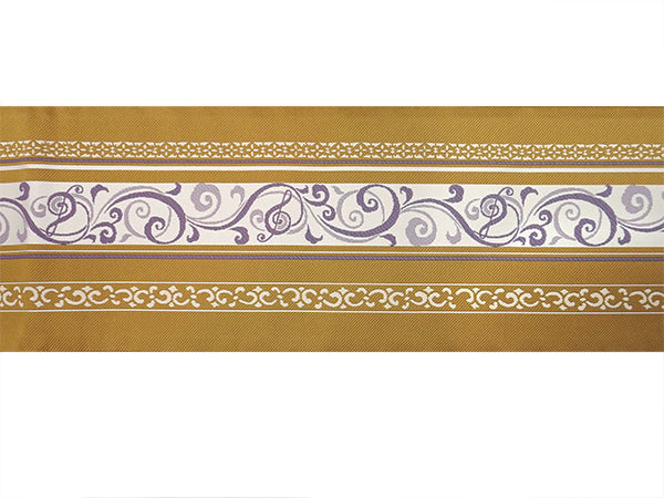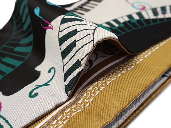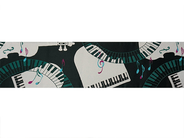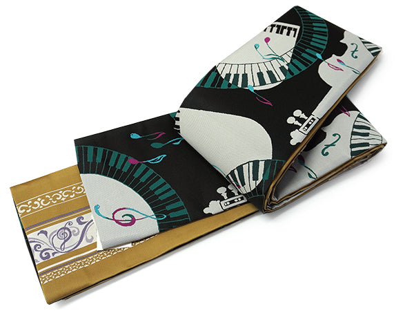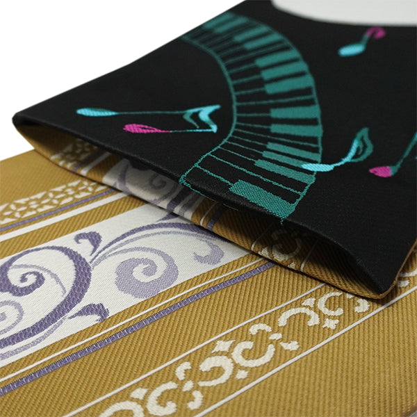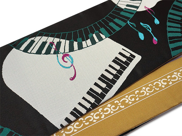 表:黒地にピアノやバイオリン、音符などが音を奏でるように織り込まれています。 裏:濃いからし地に音符や更紗模様が入った縞柄がおしゃれに織り込まれています。 |